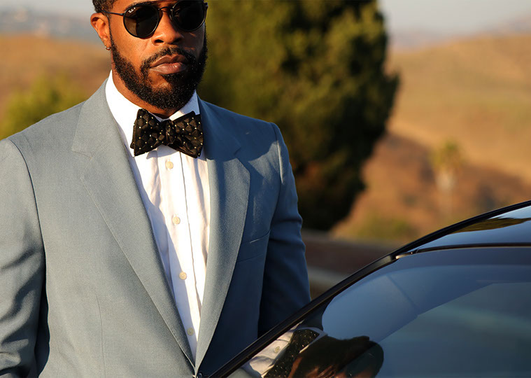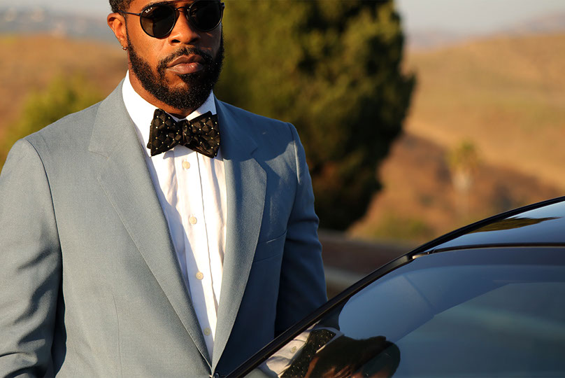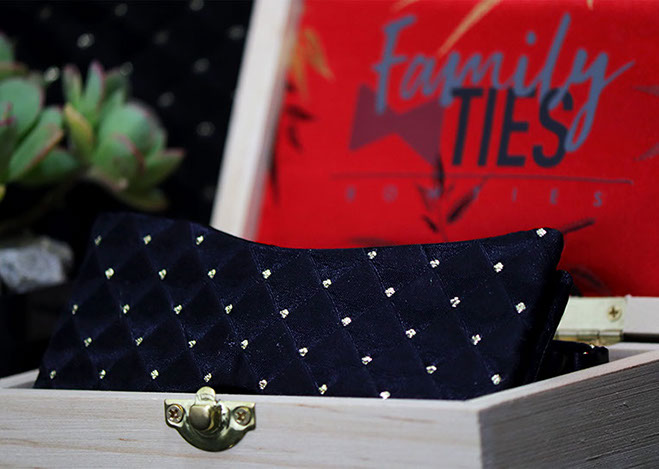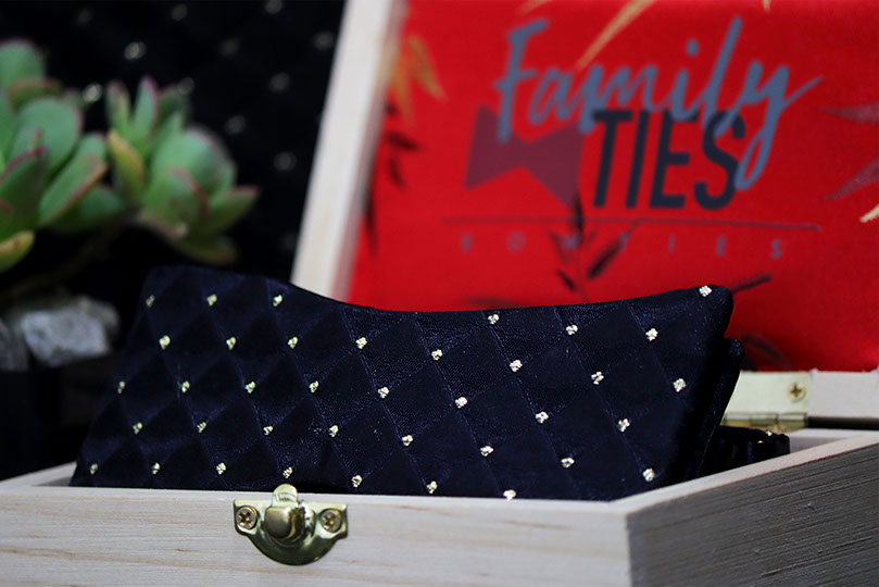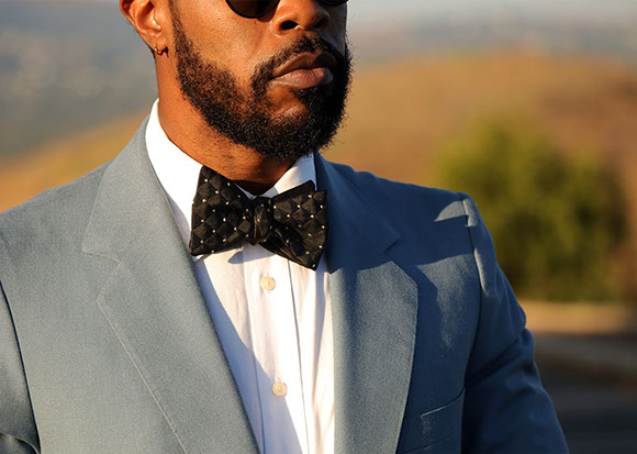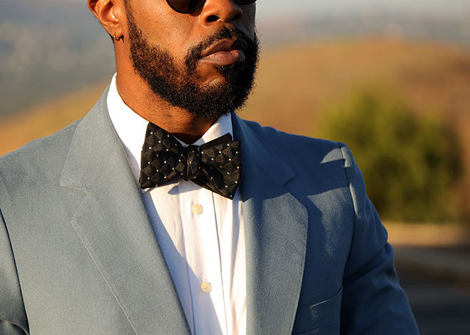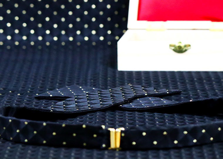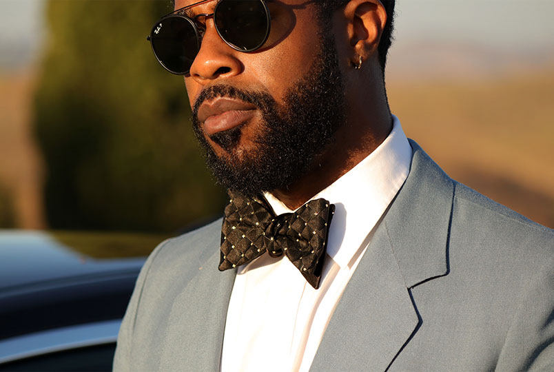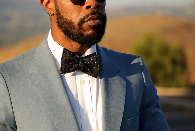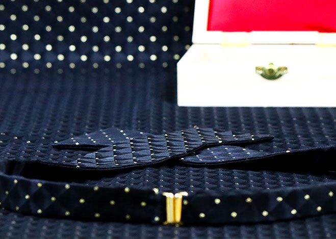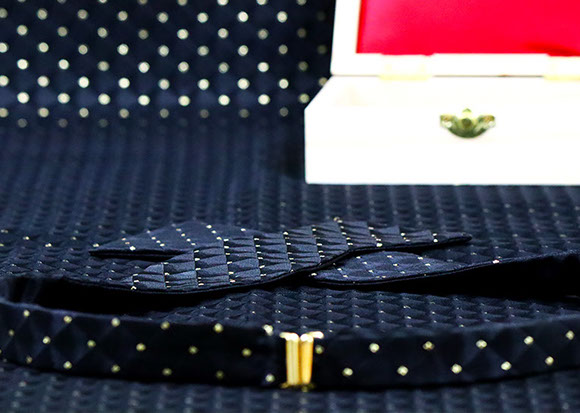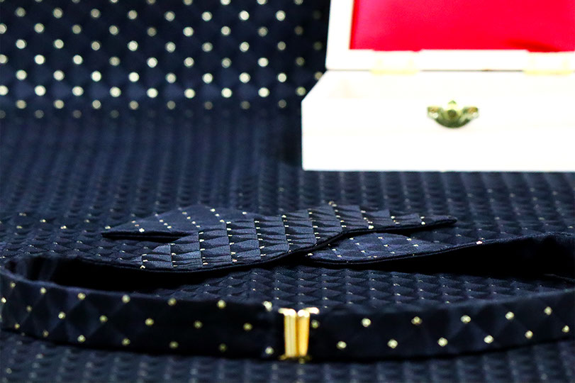 Enjoy the red carpet treatment with the Hollywood bow tie. A bold, timeless black and gold Brocade fabric with triangular dimension. This tie can be paired with just about anything. The Hollywood bow tie would not exude luxury without the signature gold hardware.