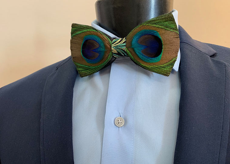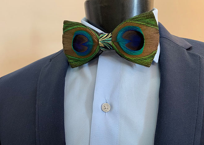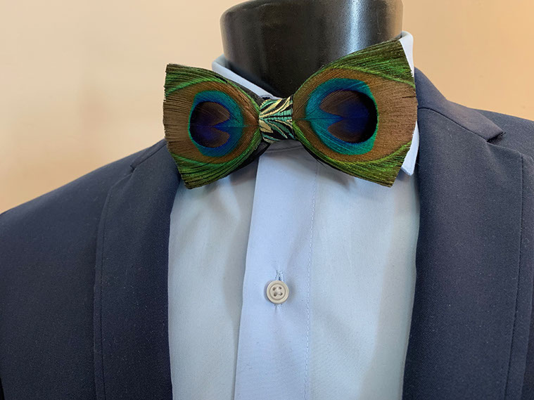 The Eye is a beautifully handmade bow tie with real, ethically sourced peacock feathers. This elegant, vibrant bow tie will set you apart from anyone in the room. The feathers are vivid and have a breath taking iridescence. Each tie comes laced with the Tradition pattern neck strap and signature gold hardware. Pre-tie only.